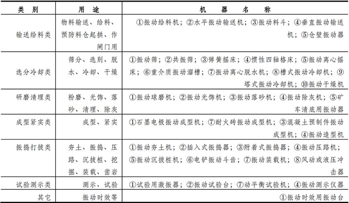 表 l―1 按用途对振动机械进行了分类,并列举了各种常见振动机械的名称。